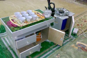 وعن مكونات هذه الطربيزة ذكر إنها مثلها مثل الطربيزة التي تعتمد عليها بائعة الشاي في حفظ أشياءها، فهي بها مكان مخصص في أسفل الطربيزة لحفظ البن والبهارات والسكر، وفي الأعلى بها مكان مخصص لحفظ (الفناجين)، وأيضاً بها مبخر خاص، وعن الأسعار ذكر إنها تبدأ من ثمانمائة جنيه وتصل إلى ألف وخمسمائة جنيه للمصنوعة من (القزاز) .