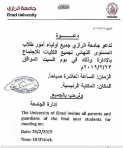وبحسب ما نقل من بعض مواقع التواصل الاجتماعي فقد دعت جامعة الرازي المعروفة جميع أولياء أمور طلاب المستوي النهائي لجميع الكليات لاجتماع بالإدارة يوم السبت القادم 22/2/2019 في تمام الساعة العاشرة صباحاً, وختمت إدارة الجامعة خطابها بترحيبها بالجميع.