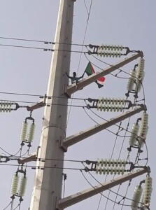وبدأ الشاب وهو يعتلي قمة برج كهرباء ضغط عالي بالعاصمة السودانية، رافعا علم بلاده غير مبال بالخطر، خلال مواكب “العدالة اولاً” التي دعت لها قوى الحرية والتغيير في الخرطوم يوم الخميس.