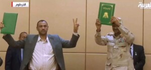 ونقلت عدة فضائيات دولية في بث مباشر مراسم التوقيع بالأحرف الاولى على الإعلان الدستوري في السودان، والذي من شأنه أن يمهد الطريق لتسليم السلطة إلى هيئة انتقالية جديدة غالبيتها من المدنيين.
