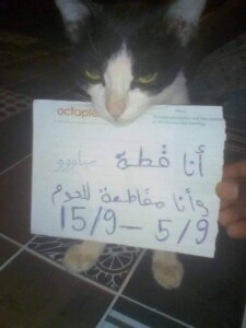شاهد الصورة الأكثر تداولاً.. “قطة” سودانية تساند الشعب وترفع لافتة تعلن فيها مقاطعتها لأكل اللحوم