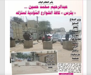 في ذاك اليوم تحديداً قرر وزير الدِفاع في حكومة المخلوع عبدالرحيم محمد حسين الاقتداء بالثوار فأمر بـ(تتريس)الشوارع المؤدية لمنزل حرمه الأُولى، ولأنه في ذلك الوقت أكثر نفوذاً ، أمر بإغلاق تام لخمسة شوارع ( 2) قبل المنزل ، (2) بعد المنزل والشارع المؤدي للمنزل مباشرة، بخرسانة تمنع دُخول أي سيارة وإن كانت ” إسعاف”، مع الحراسة المشددة للمنزل الذي يقطن فيه أبناؤه الستة، ضارباً باعتراضات القاطنين عرض الحائط، ولأنه كان يبدو كما الأسد الجريح لم يجرؤ أحد على اعتراضه!.