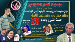 تختتم مجموعة أقمار الضواحي احدى ابرز مجموعات محبي الفنان الراحل محمود عبد العزيز اليوم، وبميدان المحس بحي مزدلفة بالحاج يوسف المايقوما، مشروع “حنبنيهو” الاول والانتقال لمشروعات السلام والتنمية مواكبة لمتطلبات المرحلة، وذلك عبر حملة التبرع بالدم رقم “28” بتشريف وزير الثقافة والاعلام، الاستاذ فيصل محمد صالح، واسر شهداء الثورة بالحاج يوسف.
