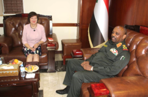 وعبر وزير الدفاع عن سعادته باللقاء، ووصف الزيارة بالتاريخية باعتبارها جاءت في نهاية فترة ولايتها وبعد التحول السياسي في السودان.