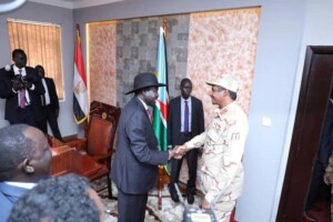 عقد النائب الأول لرئيس مجلس السيادة الإنتقالي الفريق أول محمد حمدان دقلو فور وصوله والوفد المرافق له الى مدينة جوبا ،لقاءاً برئيس دولة جنوب السودان الفريق اول سلفاكير ميارديت.