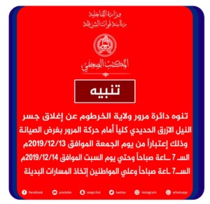 p class=”contentheading”>تنوه دائرة مرور ولاية الخرطوم عن إغلاق جسر النيل الأزرق الحديدي كليا أمام حركة المرور بغرض الصيانة؛ وذلك اعتبارا من يوم الجمعة الموافق 13-12-2019 الساعة 7 صباحا وحتى يوم السبت 14-12-2019 الساعة 7 صباحا وعلى المواطنين اتخاذ المسارات البديلة بحسب سونا.