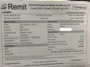 وحكى (جبريل) بحسب ما نقلت (كوش نيوز): نهار اليوم السبت ١٨ يناير ٢٠٢٠، تلقيت مكالمة هاتفية من موظفة بإحدي الصرافات، تفيد فيه بأن هناك مبلغ مالي تم تحويله لصالحي من الإمارات، إستفسرت عن إسم المحول، فقالت إسمه تاج السر موسي محمد ، لم أتعرف علي الإسم، المهم ذهبت للصرافة ، لأنه هنالك كثير من معارفي وأهلي يحولون بإسمي لصالح أهلهم ، الإسم بدا غريبا جدا.